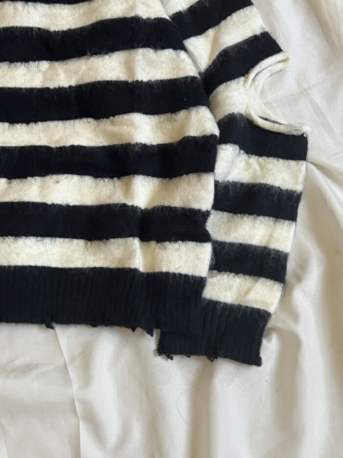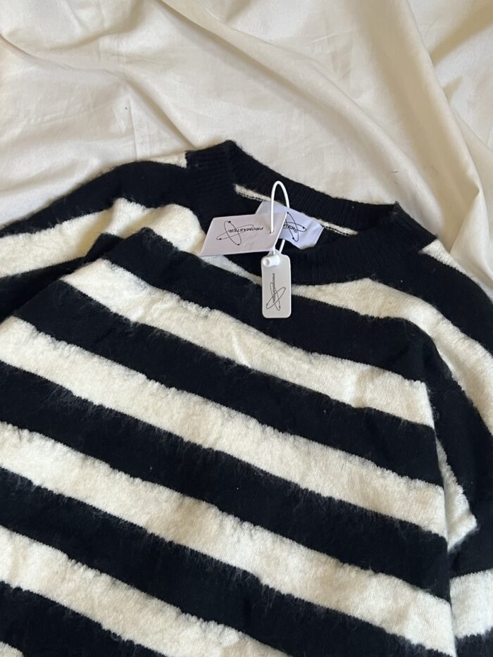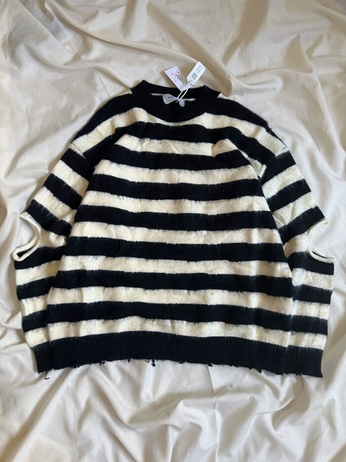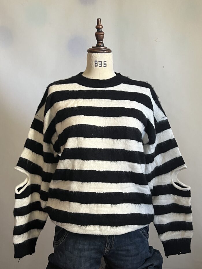 🔸 مدل: راهراه مشکی/سفید با طراحی خاص روی آستین